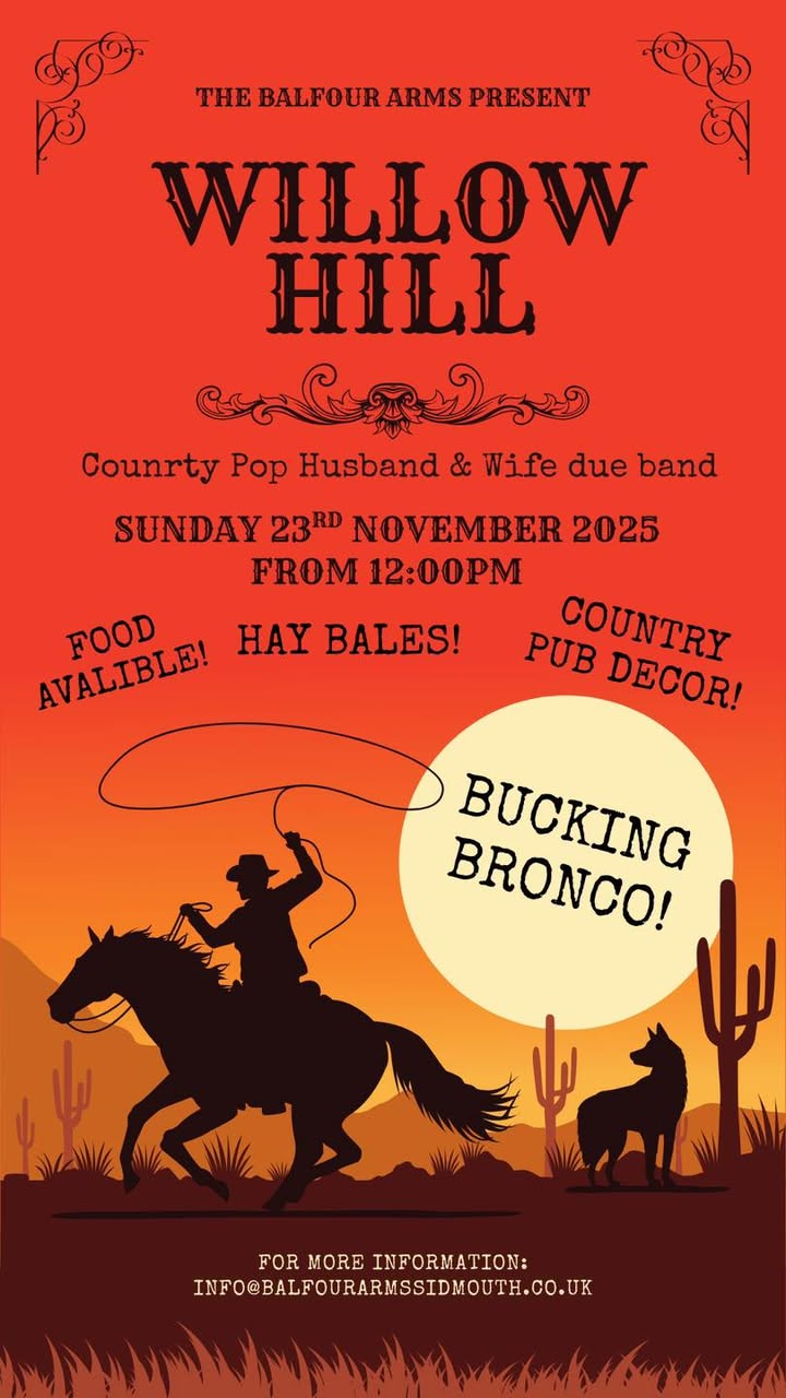 On Sunday 23rd November, we've got something very special for you right here at the Balfour! 🤠 Willow Hill will be joining us all the way from Nashville, bringing all the best country pop in the area! But wait, there's more! 💃 We have a bucking bronco taking over the garden alongside lots of hay bales & county and western decor to fill the pub too! 🎶 Tickets are online and available to buy now. https://www.ticketor.com/balfourarmssidmouth/tickets/willow-hill-330855#buy